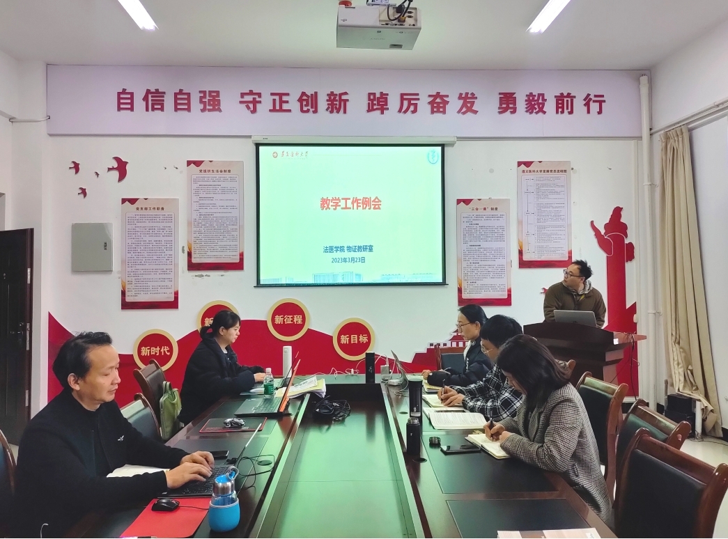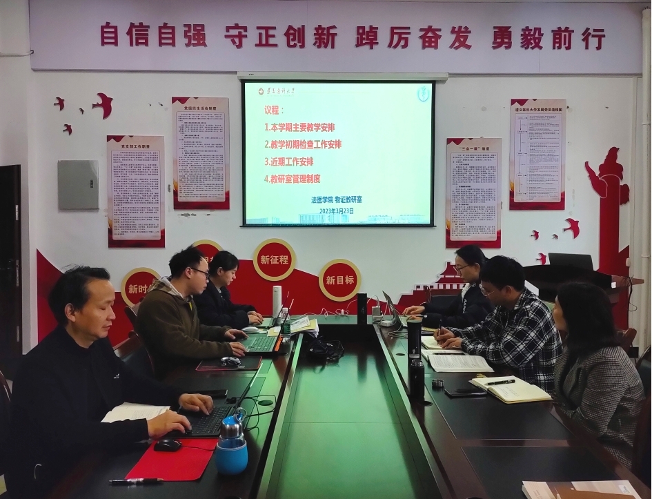 会上,刘勇对本学期教学工作进行了安排:要配合学校、学院做好本科教育教学审核评估工作;常规开展好各教研活动;加强新教师的教学能力、科研能力的培养,做好试讲、听课等;重视网络课程建设,主要是学习通课程建设,重视形成性评价材料;《法医物证学》和《法医人类学》教学大纲持续修订。还对近期工作进行了安排,宣布调整了物证教研室所承担课程负责人分工。强调教研室要加强管理制度建设,如教学档案收集装订归档,教学例会制度、三期检查制度、试讲、集体备课、听课制度、考试安排、教学相长会、教学提醒制度、教学总结等。随后,教研室对教学初期教学工作进行了检查,各项教学工作顺利进行。