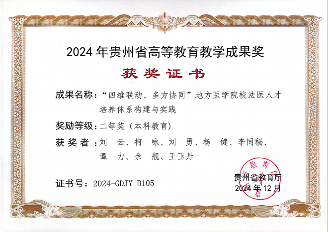 躬耕教坛育英才,守正创新结硕果。近日,贵州省教育厅正式公布2024年高等教育省级教学成果奖获奖名单,我院《"四维联动、多方协同"地方医学院校法医人才培养体系构建与实践》项目,荣获本科教学成果二等奖,实现贵州省法医学本科教育领域省级教学成果奖的新突破。