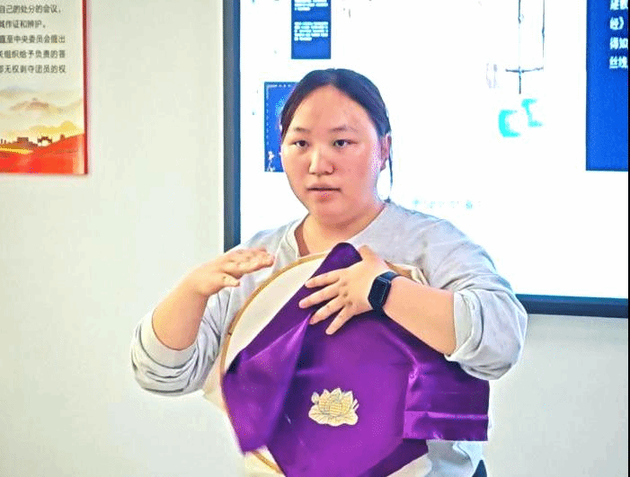 苗族祭鼓节的传承人李英倩同学以“贵州苗绣”为主题,深入阐释了贵州苗绣的文化历史、发展脉络,以及苗绣主要流派及其独特的风格。现场的师生们被这浓郁的苗绣文化深深吸引,对苗绣强烈的象征意义感到新奇,并渴望通过手中的针线,传承并发扬苗族这一独具特色的艺术——苗绣。