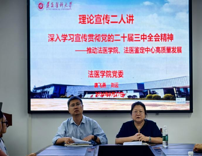 为扎实推进学习贯彻党的二十届三中全会精神,让党的创新理论在基层落地生根,2024年9月27日,法医学院党委书记唐飞燕同志与党委副书记、院长刘云同志以“深入学习贯彻党的二十届三中全会精神,推动法医学院、法医鉴定中心高质量发展”为题,在法医学院会议室为师生开展了“理论宣传二人讲”。
